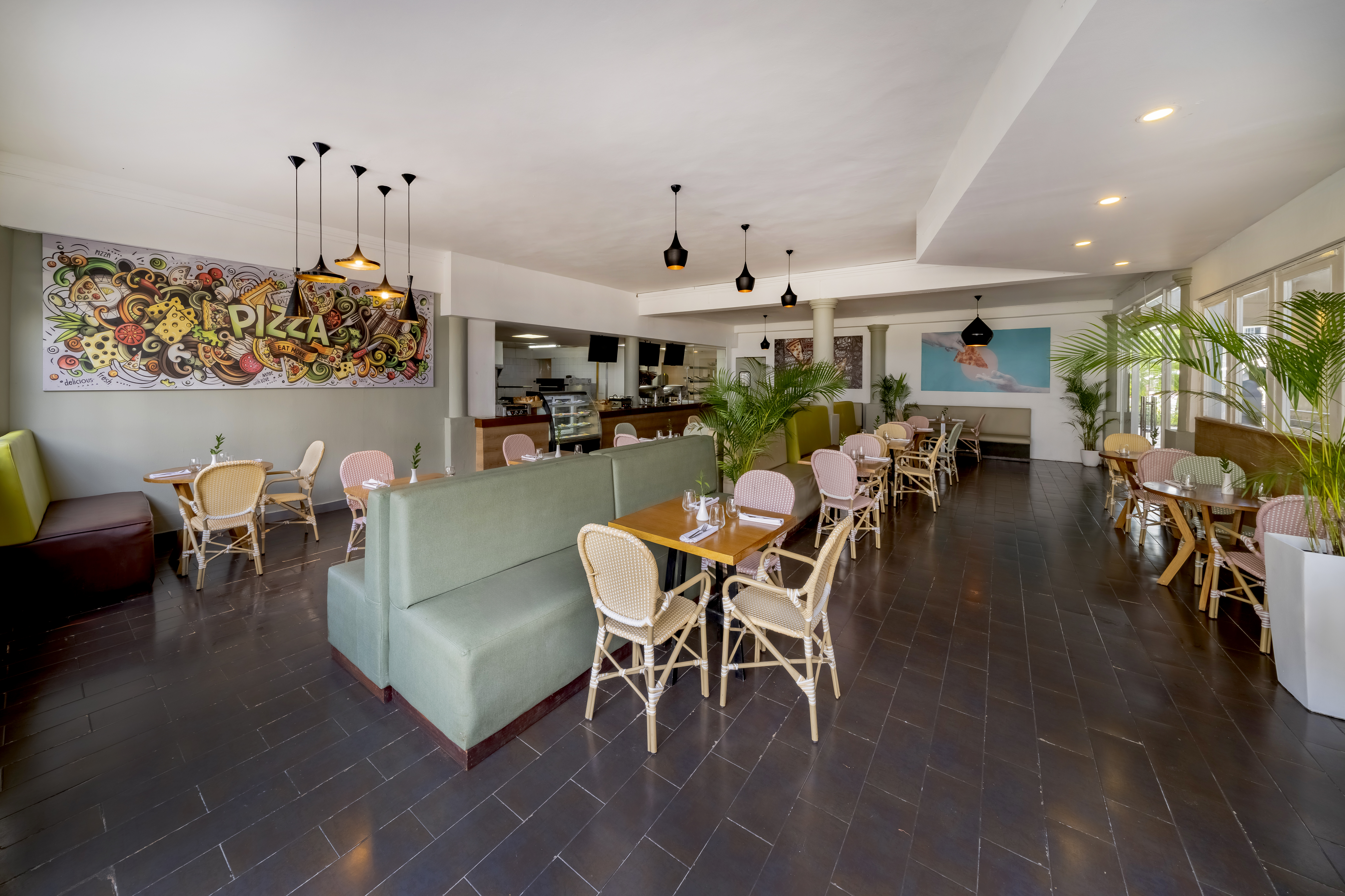 Deliciosa pizza recién hecha y refrigerios clásicos.